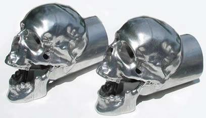 Skull Exhaust Tip is made out of 319 cast aluminum. This highly detailed, unpolished skull will give your ride a look that will blow your mind! Our exhaust belching skull will fit without adapters over a stock 4", 3.5", 3", 2.5", 2 1/4" or 2" automotive exhaust pipe and will not restrict air flow. This is not a cheap plastic toy. This is the real deal! We guarantee you won't be disappointed.